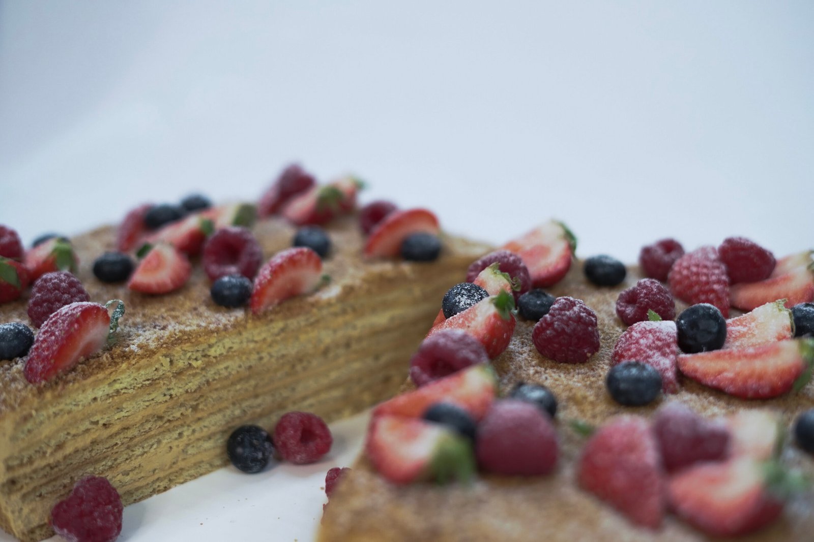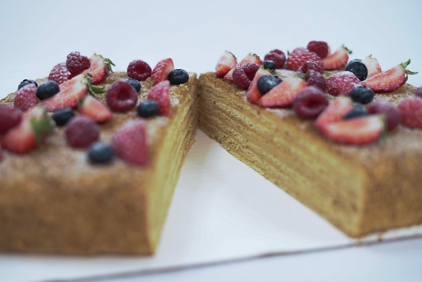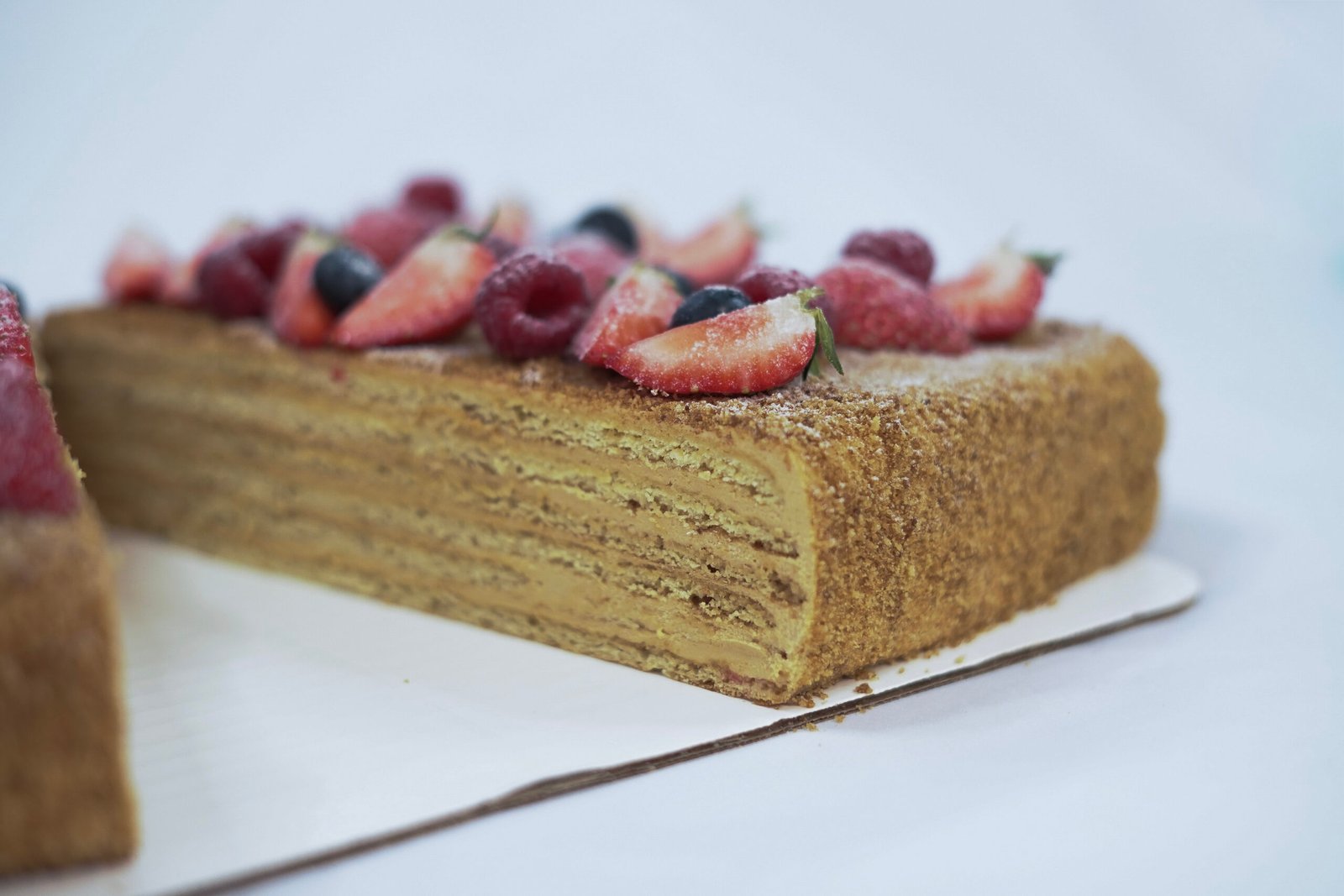 Indulge in the irresistible combination of honey-baked cake layers and caramel filling cream made from homemade dulce de leche. The subtle notes of honey blend perfectly with the soft and feather-light cream, creating a uniquely addictive cake that's sure to satisfy your sweet cravings.